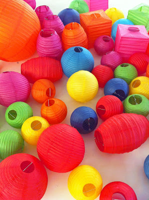 Planning a party in an airplane hangar for 400 people was a new experience for me. The space was HUGE and it was hard to find anything to make a big impact on a small budget. I ordered giant Chinese lanterns in all shapes, colors, and sizes and tied them together to hang from the very tall ceiling. It looked fantastic, and it was fairly simple to do. It just goes to show that you can pretty much have a party anywhere!
